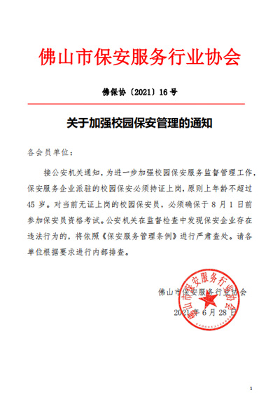 關于加強校園保安管理的通知 各會員單位: 接公安機關通知,為進一步加強校園保安服務監督管理工作,保安服務企業派駐的校園保安必須持證上崗,原則上年齡不超過45歲。對當前無證上崗的校園保安員,必須確保于8月1日前參加保安員資格考試。公安機關在監督檢查中發現保安企業存在違法行為的,將依照《保安服務管理條例》進行嚴肅查處。請各單位根據要求進行內部排查。 佛山市保安服務行業協會